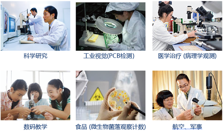 科学研究、数码教学;工业视觉(PCB检测, IC质量控制);医学已疗 (病理学观测);食品 (微生物菌落观察计数);航空、军事 ············