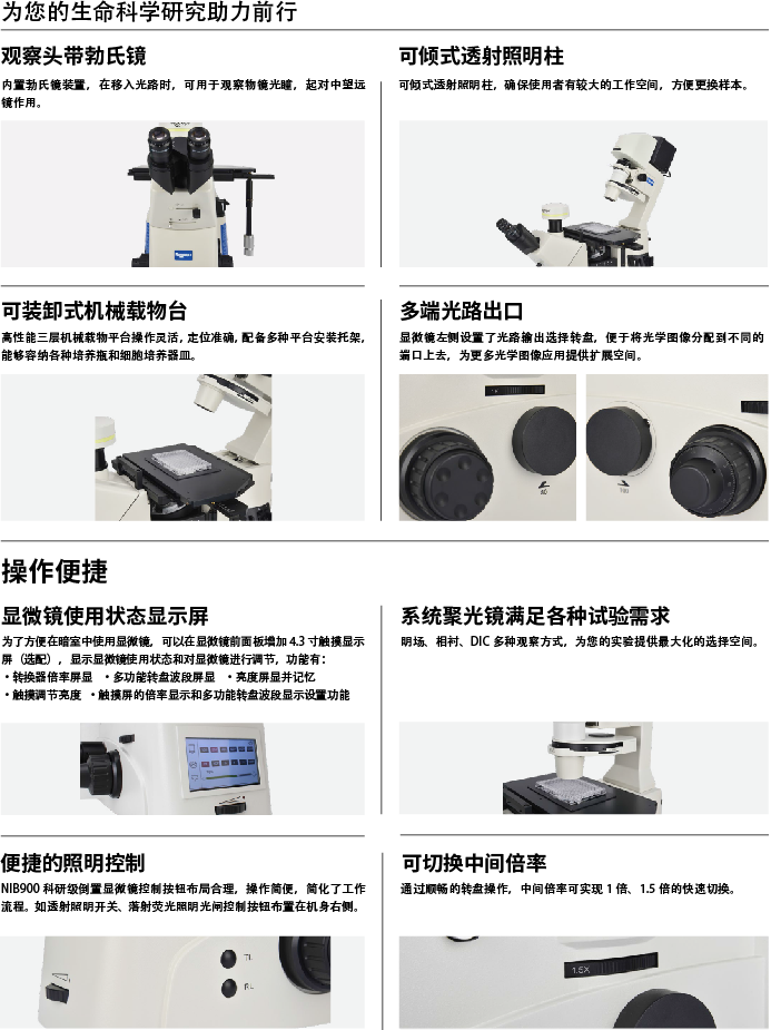 简要描述:倒置研究级生物显微镜NIB900带勃是镜头观察可后倾式灯架转盘式聚光镜,平场半复消色差物镜。
