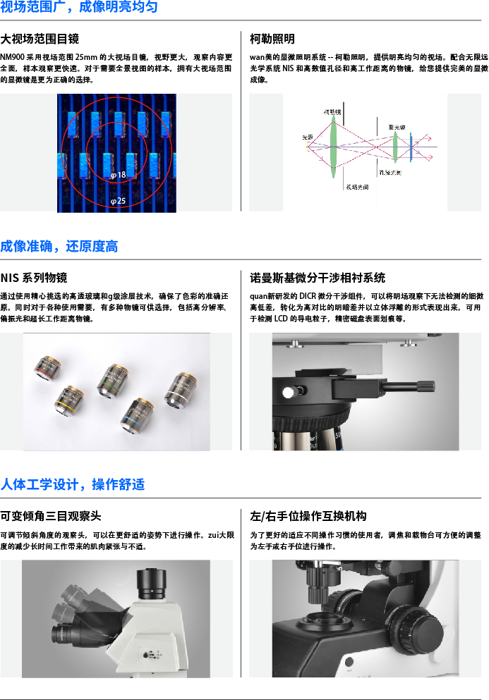 采用NIS无限远光学系统,具有工作距离长,色彩还原度高,成像清晰等出色的光学品质,成像可靠,提供高对比,清晰明亮的图像。