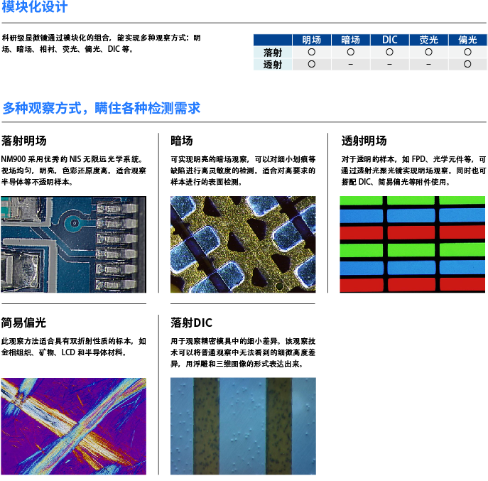 采用模块化设计,实现明场、暗场、微分干涉、荧光、偏光等观测方法。是半导体器件、FPD、电子器件、材料、精密模具制造的质控和研究的li想工具。