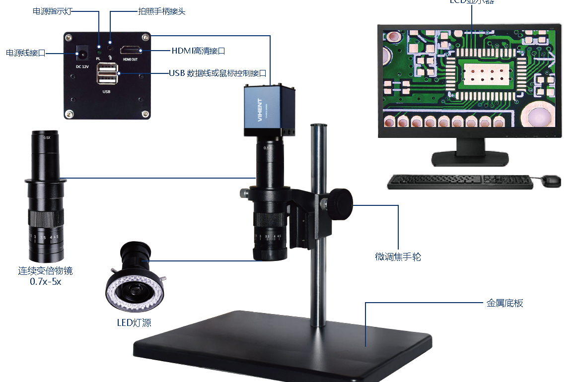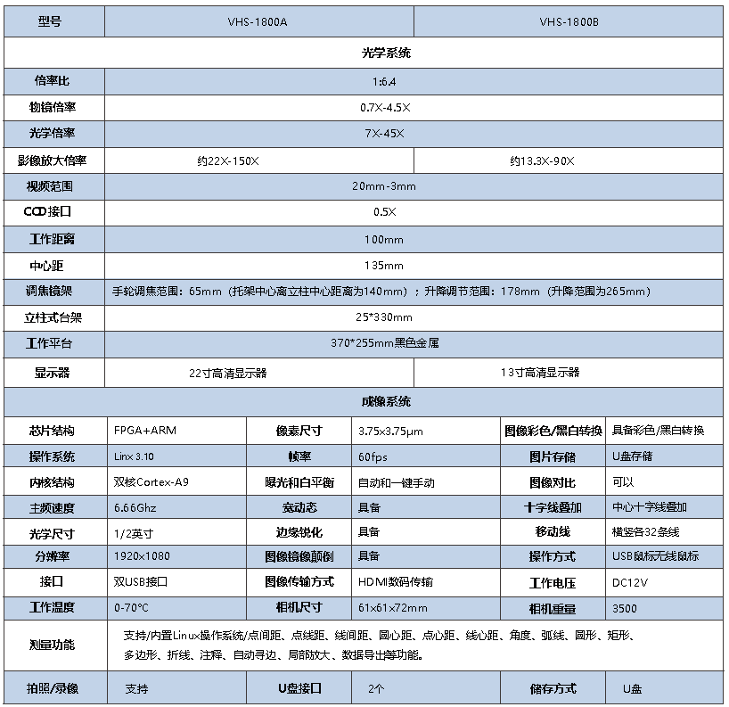 单筒检测显微镜VHS-1800系统由单筒体视显微镜与VHGQ-20HD高清相机组成,能完成对电路板等工件的图像采集与录像,并且可选装测量版的高清相机,对图像进行测量操作等。单筒视频显微镜是一种连续变倍单筒显微镜,它采用了好的消杂光和大景深技术、具有成像清晰、立体感强及工作距离长、视野宽阔等特点,与高清晰度的彩色CCD和电视机配套使用。