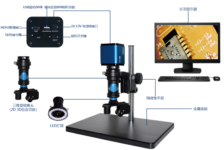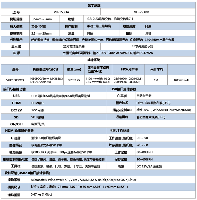 3D三维视频显微镜VH-2S3D系统由单筒体视显微镜与VGQ1080PCQ高清相机组成,能完成对电路板等工件的图像采集与录像,并且可选装测量版的高清相机,对图像进行测量操作等。单筒视频显微镜是一种连续变倍单筒显微镜,搞级光学系统,具有低畸变、高分辨率、大景深、视场宽大且平坦、齐焦性好等特点,设计新颖,操作简便与高清晰度的彩色CCD和电视机配套使用。